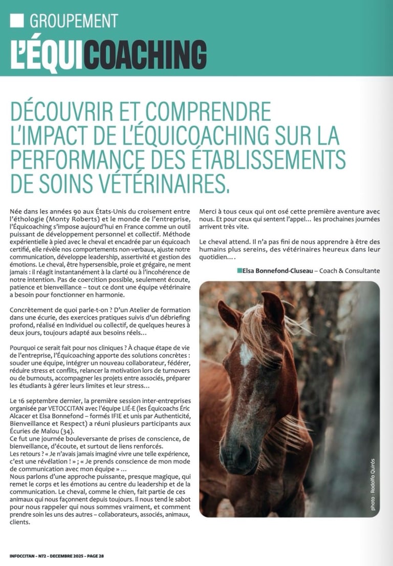 Elsa, coach Lié-e à eu le plaisir d'écrire pour le mensuel Infoccitan pour une mise en lumière de l'équicoaching.